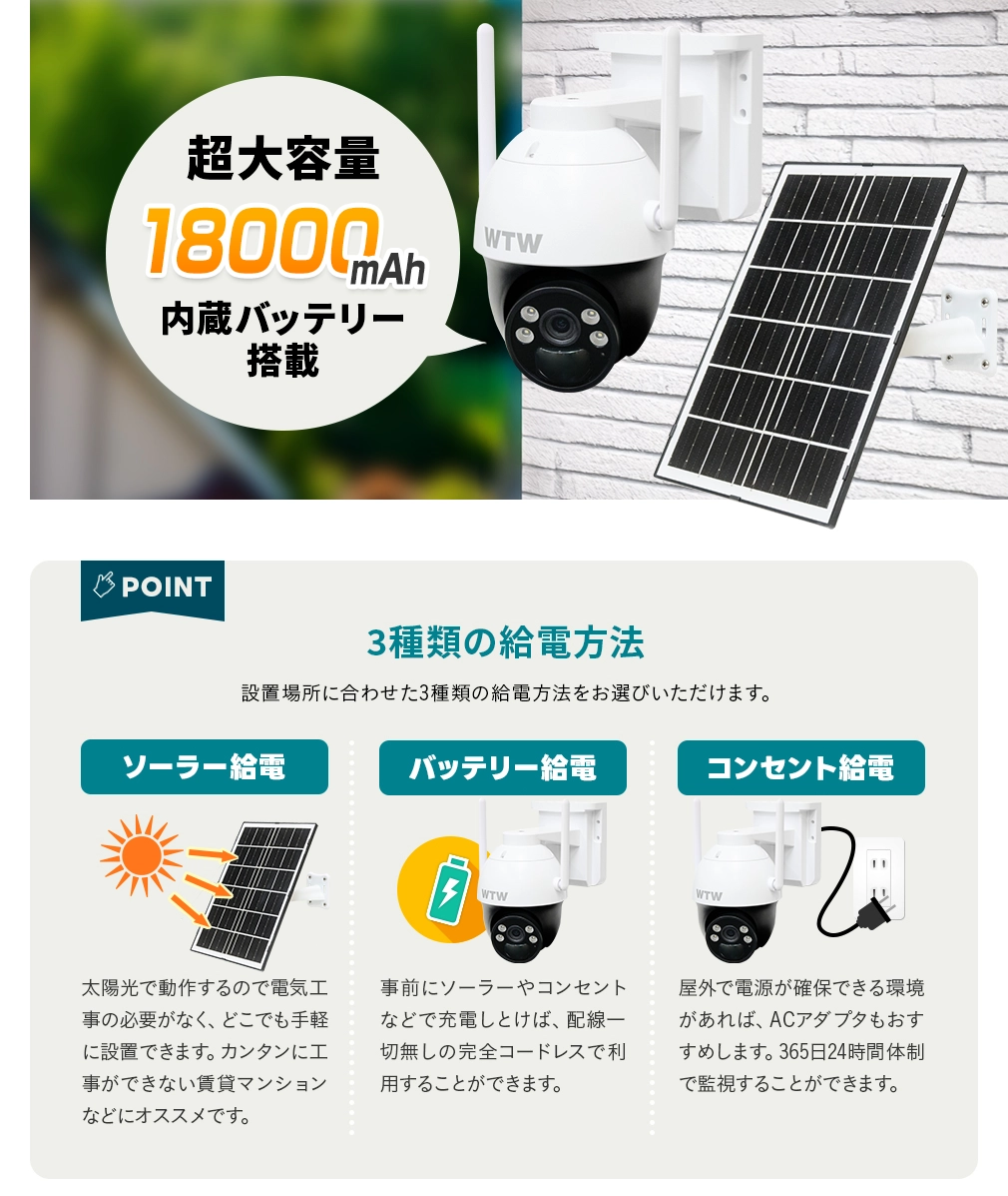 付属品 | ビス・アンカー・ソーラーパネル・柱取り付け用ステンレスバンド・電源アダプター |