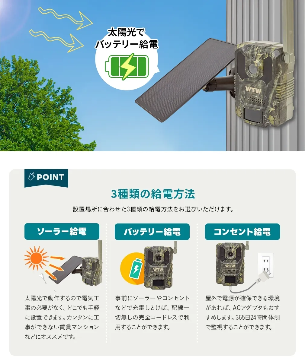 付属品 | ソーラーパネル取り付け用基台・ビス・アンカー・カメラ固定バンド・電源アダプター |