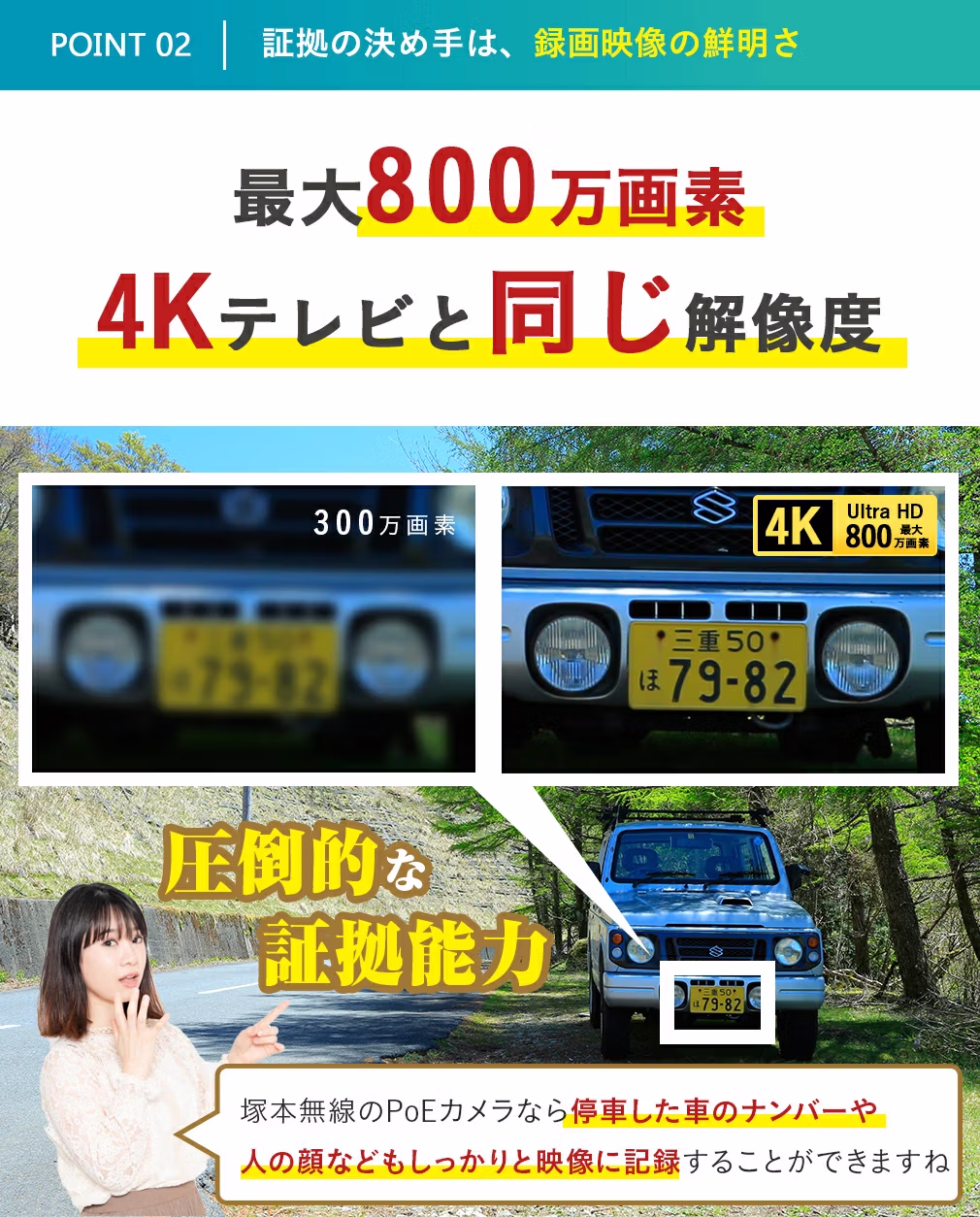 | 映像入力 | カメラ 4入力(PoE対応LANポート×4チャンネル) 4K800万画素(3840×2160) |