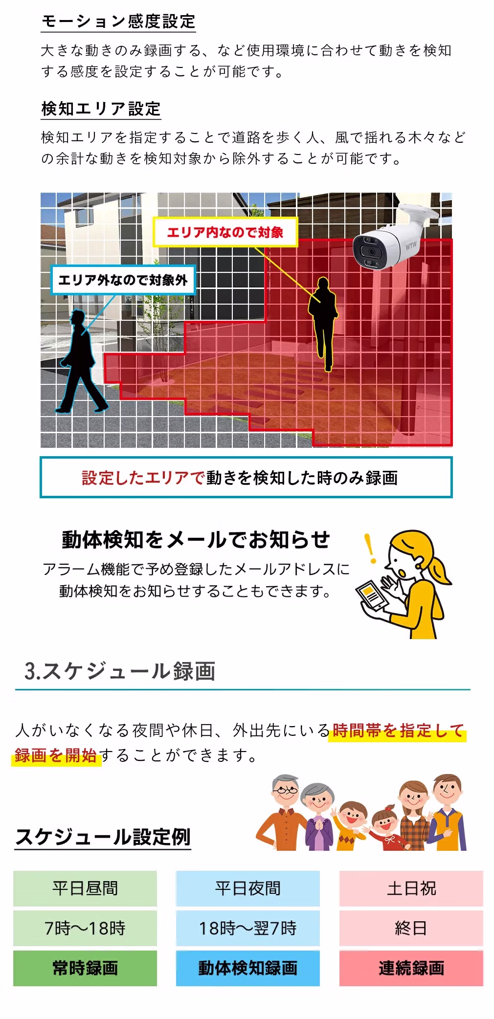 | 録画モード | 常時録画(24時間録画) / スケジュール録画 / イベント録画 |