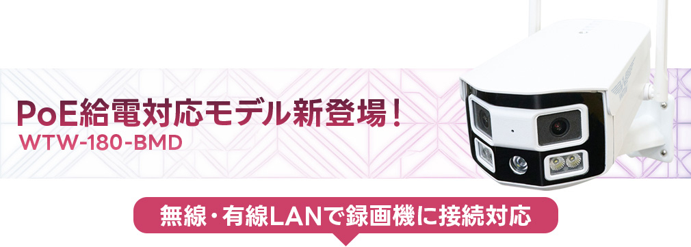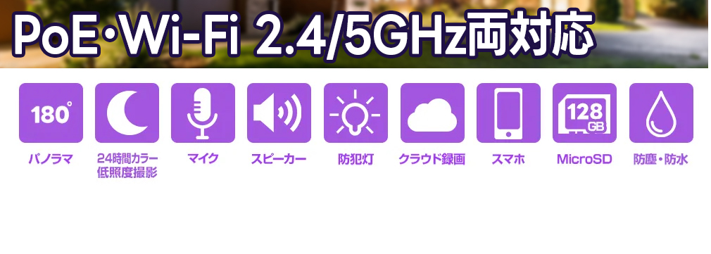 | 商品概要 | Wi-Fi/PoE接続対応 パノラマ 超広角Wレンズ搭載 防犯灯 低照度カメラ |
