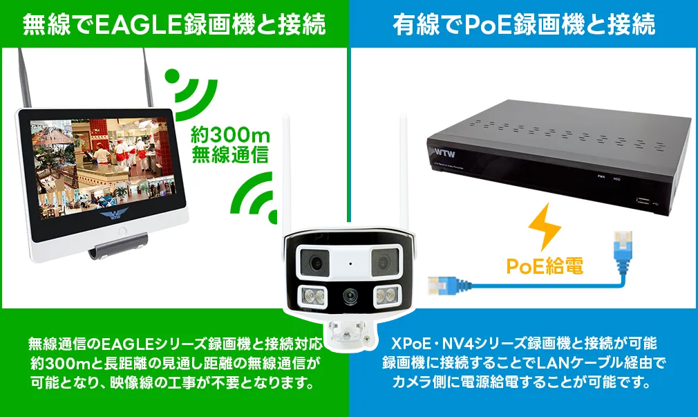 Wi-Fi/PoE接続対応 パノラマ 超広角Wレンズ搭載 防犯灯 低照度ワイドビューカメラ