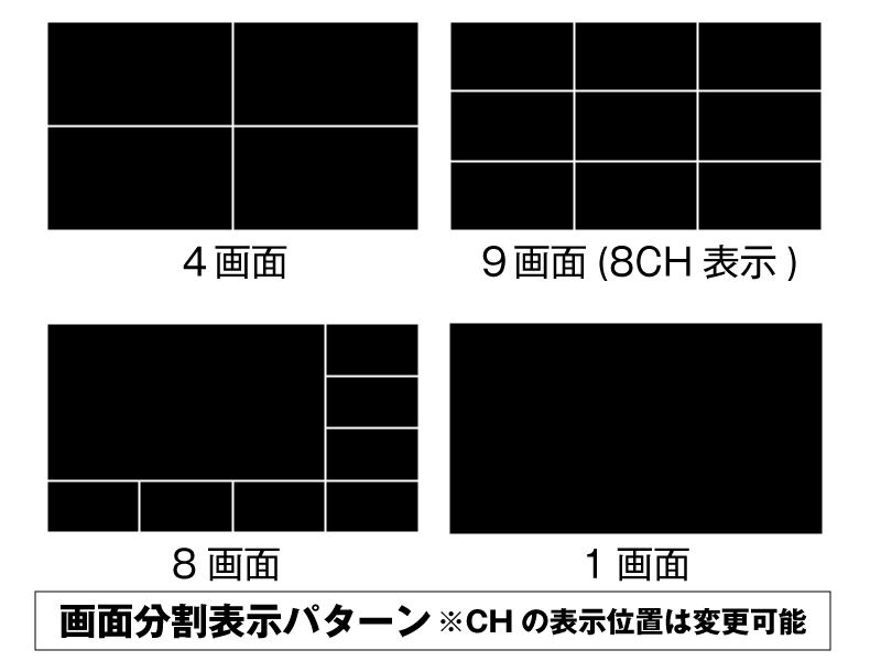 4chは小型の録画機が多くご家庭や小型の店舗向き。8ch中型店舗向き。16ch以上は大型店舗や建物全体の監視に向いた大きさとなっています。